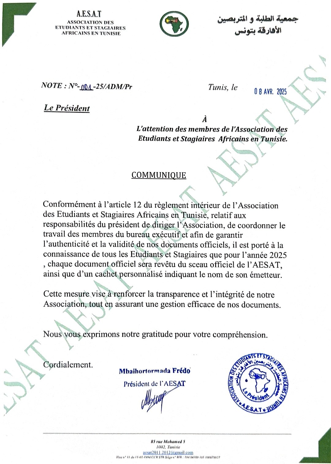 📣 Le samedi 29 Mars 2025 s’est tenue l’élection 🗳 du bureau executif de l’Association des Étudiants et Stagiaires Africains en Tunisie (AESAT) au sein des locaux de l'université Centrale business School. Le nouveau bureau exécutif avec à sa tête Mbaihortormada Fredo a été élu.